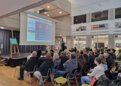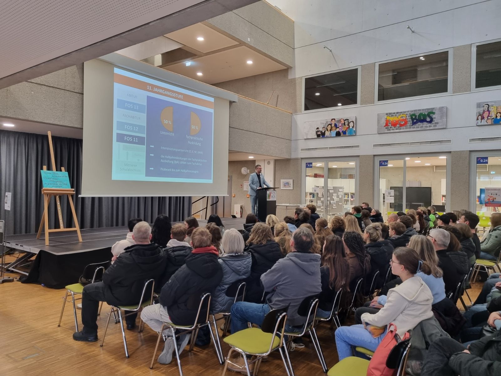 In der voll besetzten Aula erläuterte Schulleiter Christian Hofrichter die Besonderheiten dieser Schulform. Das Markenzeichen der FOSBOS ist der hohe Praxisbezug. In der 11. Jahrgangsstufe der Fachoberschule verbringen die Schüler die Hälfte der Zeit im Unterricht und die andere Hälfte in einer fachpraktischen Ausbildung in regionalen Betrieben oder sozialen Einrichtungen. Diese „50/50-Teilung“ ermöglicht es den Jugendlichen, bereits früh berufliche Erfahrungen in den Zweigen Wirtschaft und Verwaltung, Technik sowie Sozialwesen zu sammeln.